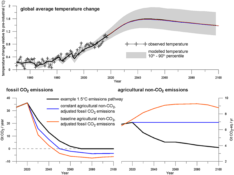 Figure | Three alternative global pathways of fossil CO2 and agricultural non-CO2 (CH4 and N2O) emissions consistent with global warming of 1.5°C. The lower panels show fossil CO2 (left panel) and agricultural non-CO2 (right panel) emissions.