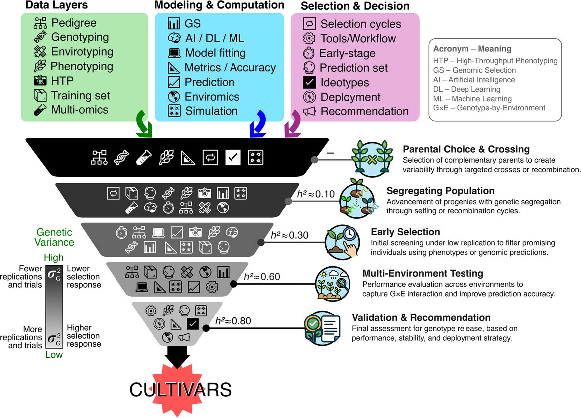 Figure | Funnel representation of the cultivar development pipeline and its main components (black and white flat icons inside each box). The five breeding stages are shown from top to bottom, illustrating the reduction in genetic variance (σG2 ) and the increase in heritability (h2) across the selection process. Each stage is linked to specific data layers (green), modeling tools (blue), and decision-making components (purple), all represented by flat icons. Icons are placed according to their most frequent or practical use, although most components could operate across multiple stages. The scale on the left highlights the decline in genetic variability and the increase in trial intensity. The pipeline converges in cultivar deployment, guided by data-driven decisions.