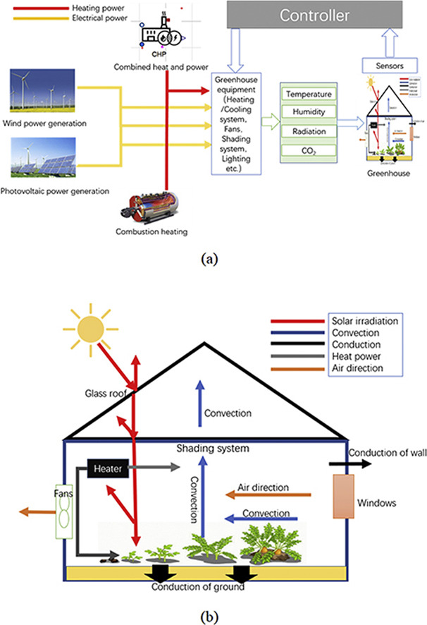 Graphical abstract | Relationship among controller, greenhouse equipment supplied by thermal and electrical energy, controlled environmental factors (temperature, humidity etc.) and sensors in the greenhouse (a), detailed thermal environment inside the greenhouse (b).