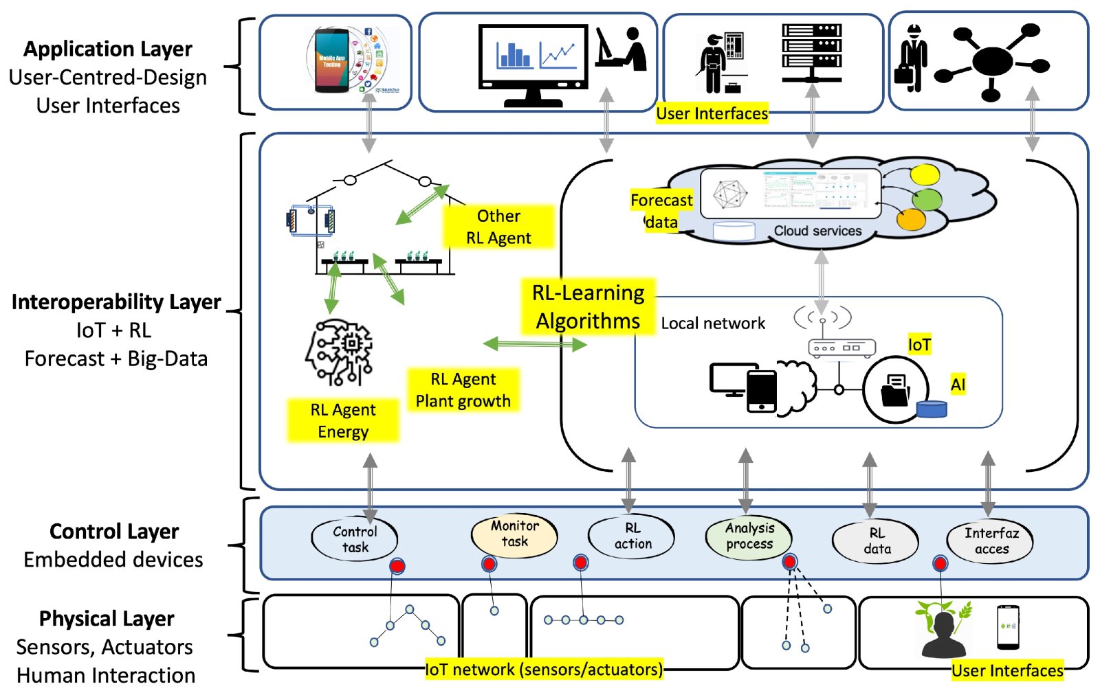 Figure | Layered technological architecture. Relationship between IoT, RL, digital platform and different interfaces.